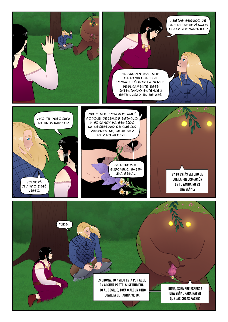 Me gusta que haga bromas, es muy… humano. También me gustan las delicadas manos de Demian haciendo el adorno o la confianza que le tiene a su secundario, como un buen amigo. Por otro lado… Qué mona la princesa preocupándose. Es gracioso ver al secundario como protagonista de una escena en la que literalmente no aparece. xD